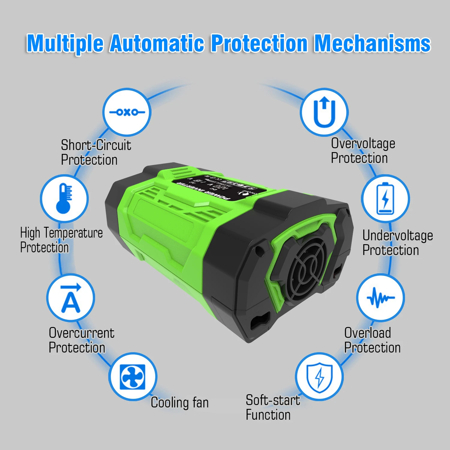 [SAFE& STRONG & RELIABLE with Multi Protection] The inverter has 7 built-in protections including overload, overvoltage, undervoltage, high temperature, short circuit, leakage, and reverse polarity protection. The rugged steel-coated casing provides drop and crash protection. Dual intelligent temperature-controlled fans greatly reduce machine temperature, minimize battery consumption, and extend battery life.Equipped with LED indicators for under-voltage and over-voltage protection, over-temperature protection, over-load protection, and short circuit indication for enhanced safety measures.