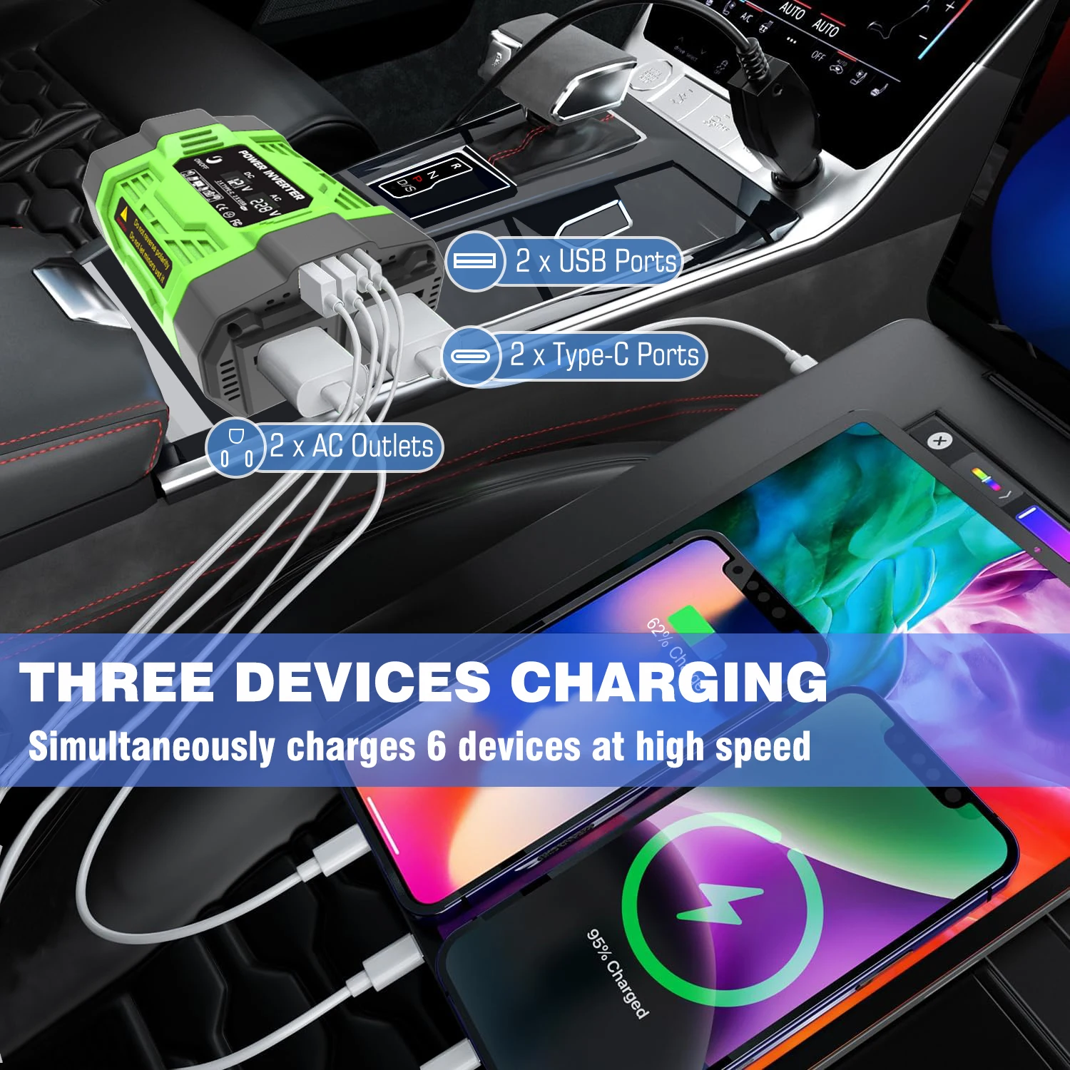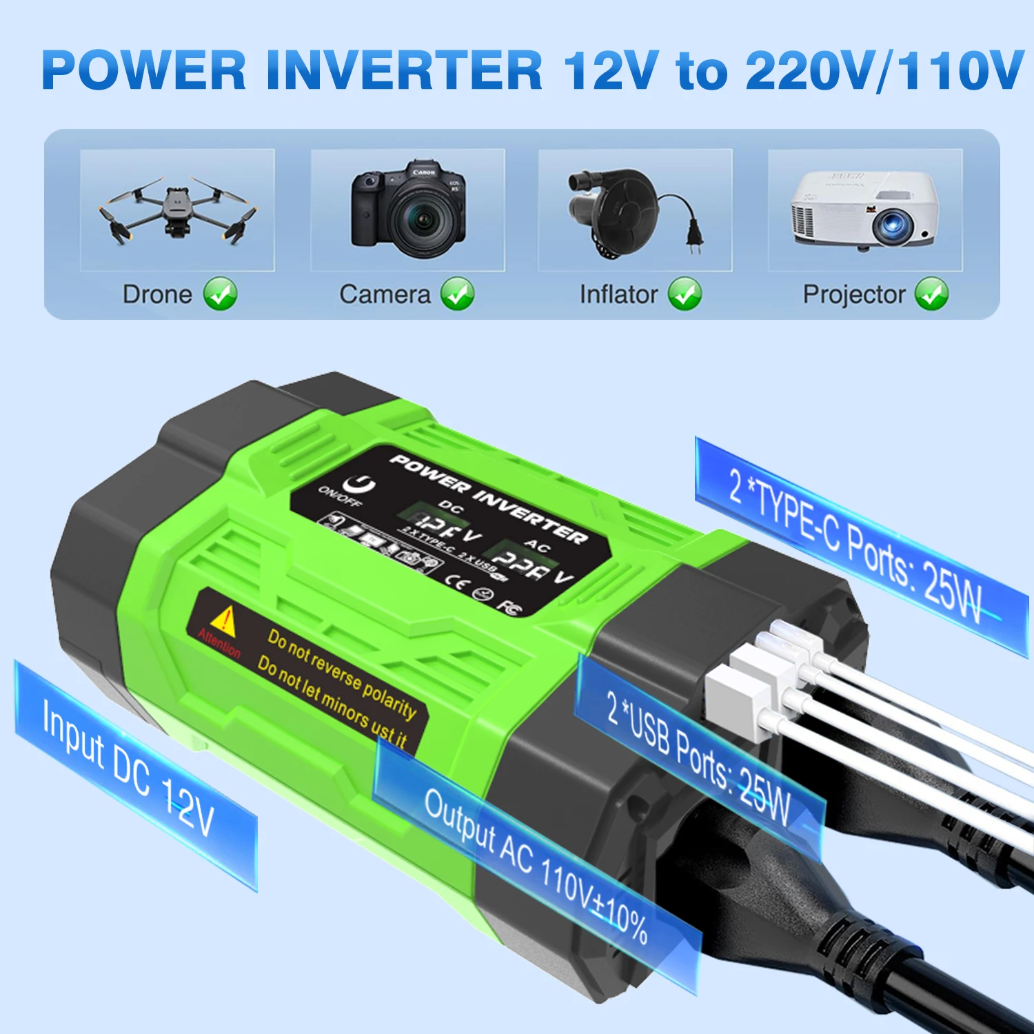[High Efficiency and Durable] It is compatible with all types of 12V batteries, catering to your various power needs whether you're on an RV trip, camping, road tripping, living off-grid, or in an emergency situation, providing stable power supply. It is suitable for all electrical appliances, up to 500W. with an impressive conversion efficiency of over 90%.