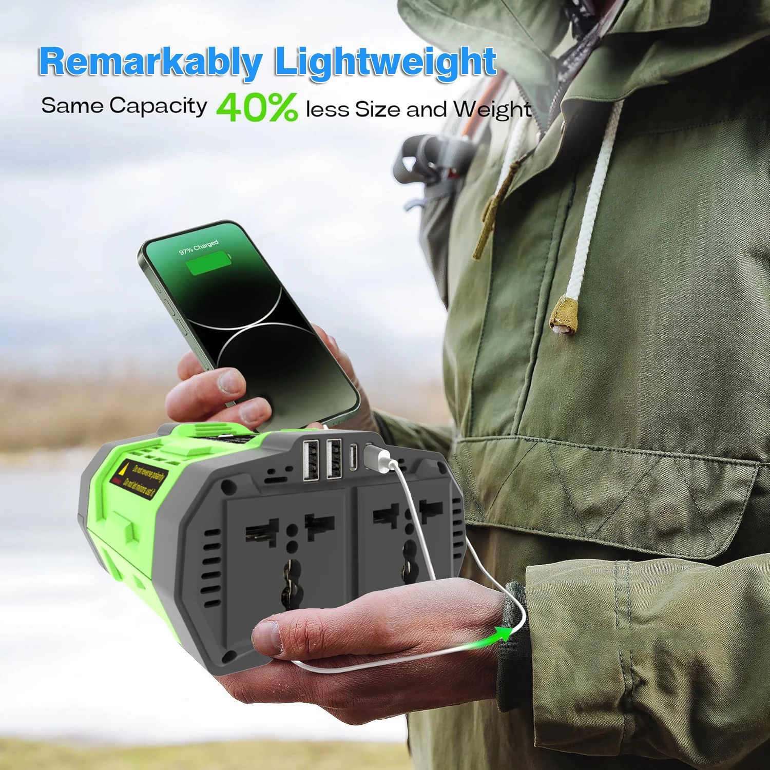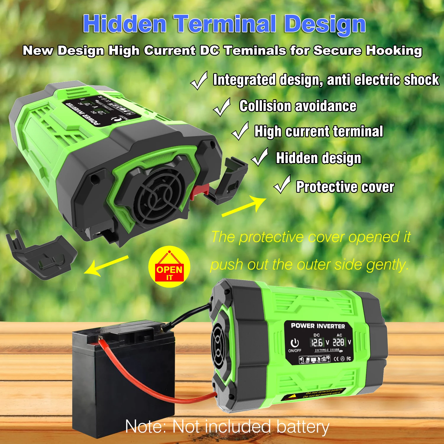 [Wide application] 500W (1000W surge)power invertersupports most laptops, tablets, phones, lights, fans, CPAP medical devices, projectors, TV, camera etc,can be as a Emergency Power Supply(rated power less than 500W). with 2 AC receptacles, Smart LCD display, 2 USB Charger Ports, 2 Type C Charger Ports, double cooling fan, high current DC Hidden terminals, light weight makes it compact and perfect for camping, car trips and other family outings. It can also use with solar system.