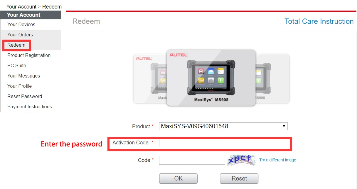 3.Log in https://www.autel.com/,"Your Account>Redeem",and enter the TCP cards password.Complete the Update.