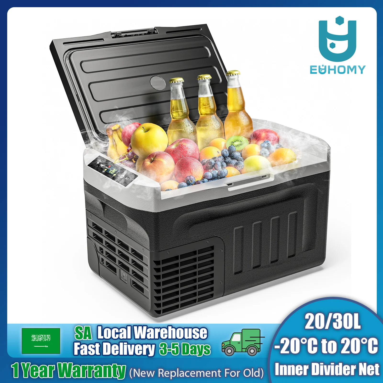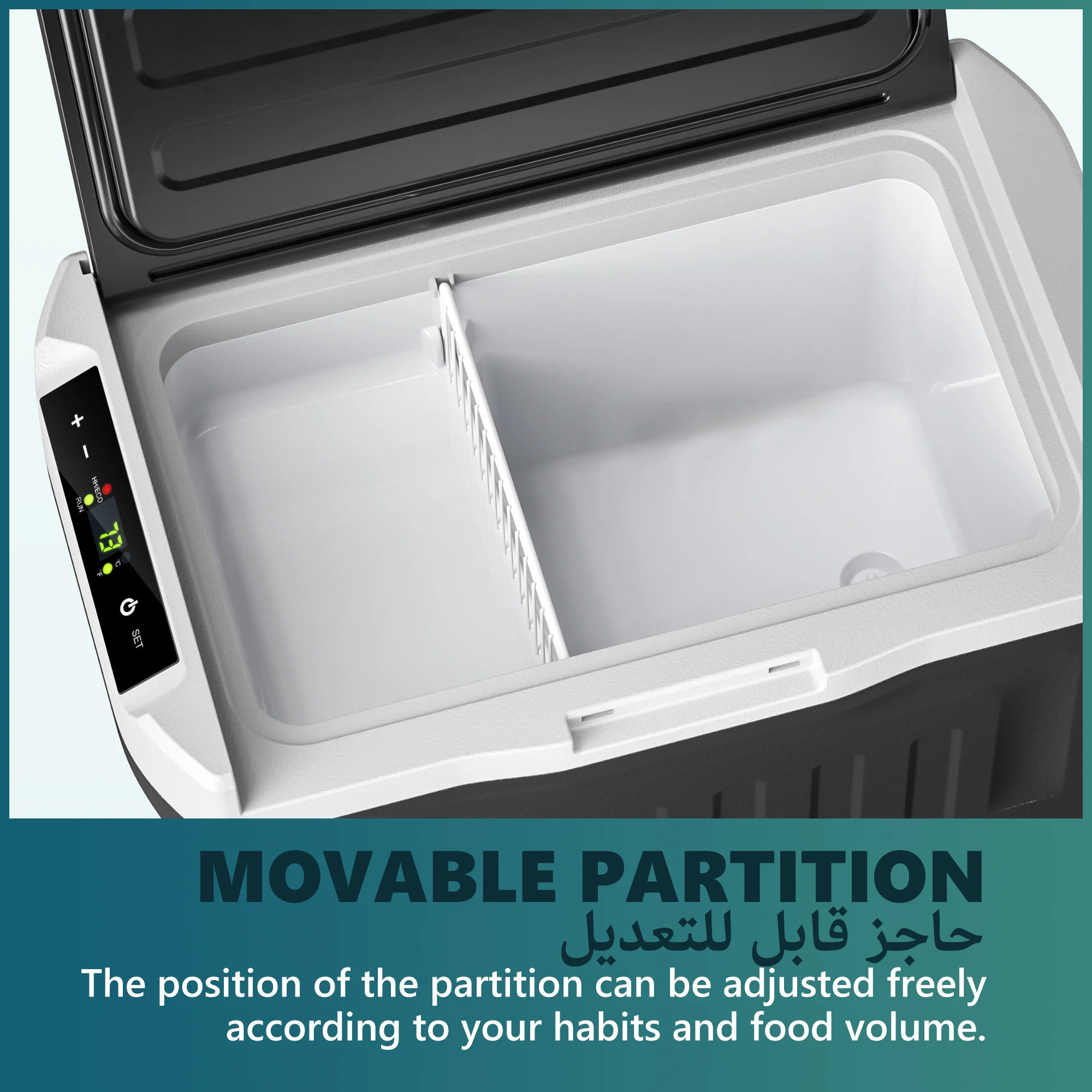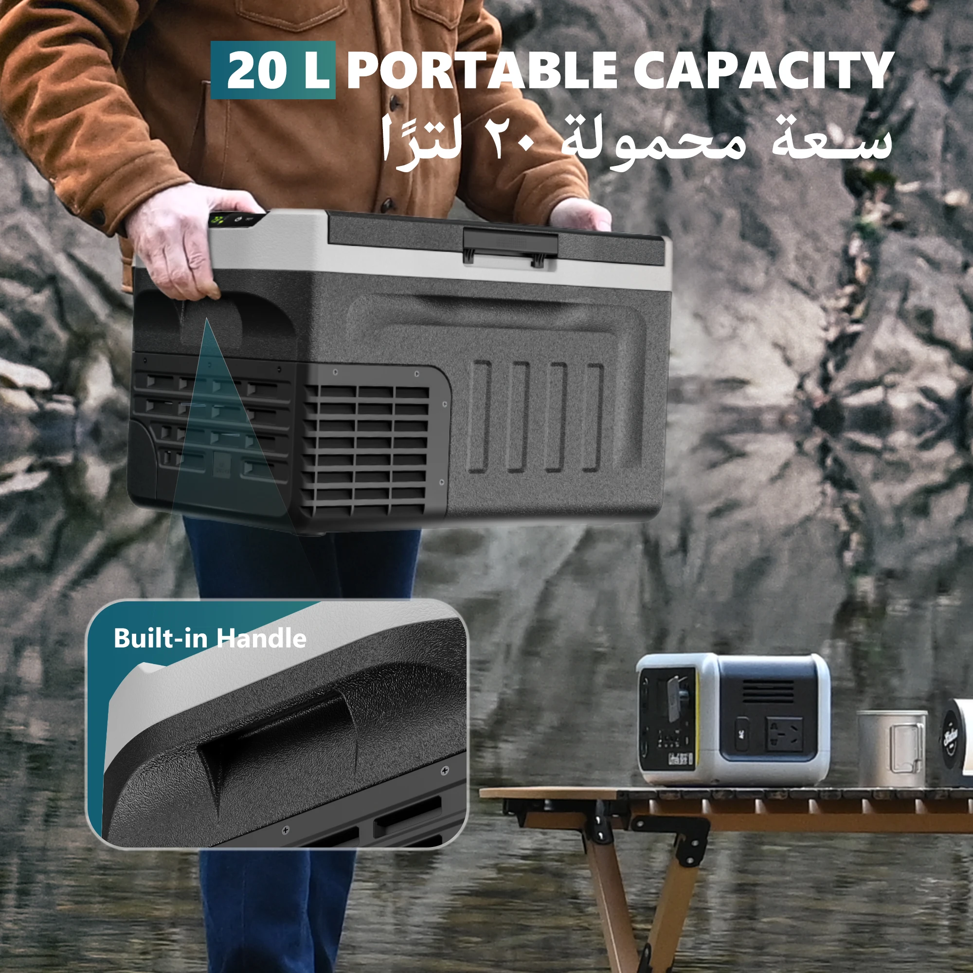 This car refrigerator offers a 20L/30L capacity, ideal for storing food and drinks during travel, ensuring items remain fresh and cool.