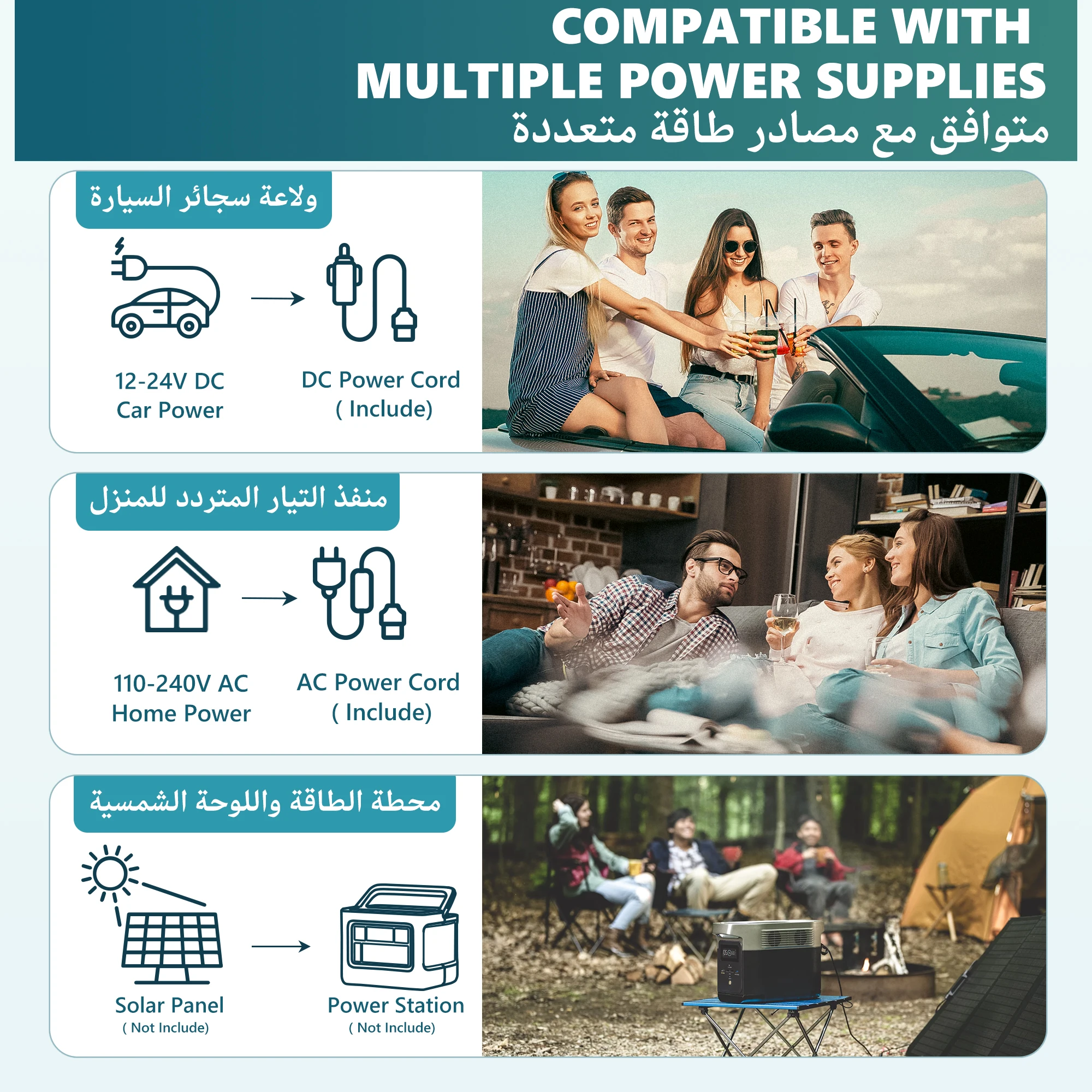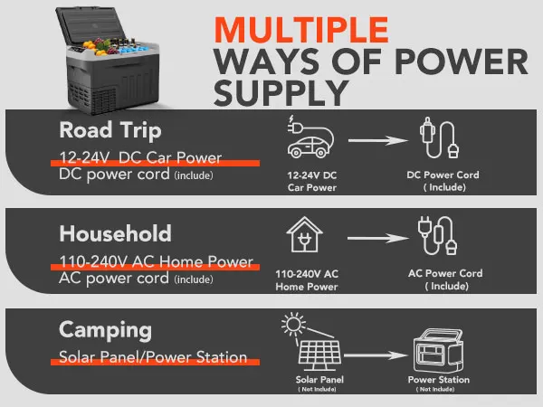Operates on 12/24V DC and 110-240V AC, making it suitable for trucks, vans, RVs, campers, SUVs, and home use.