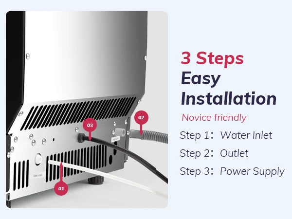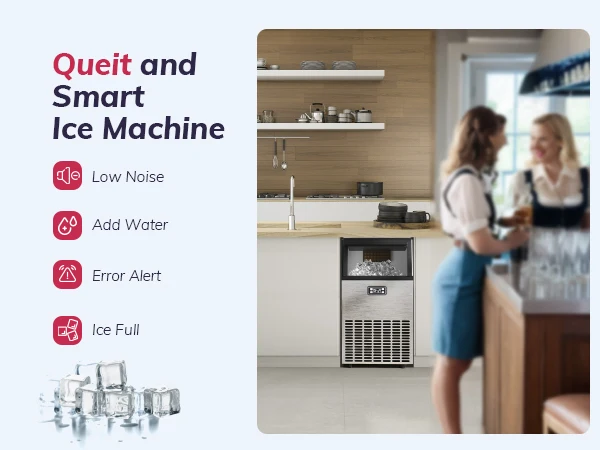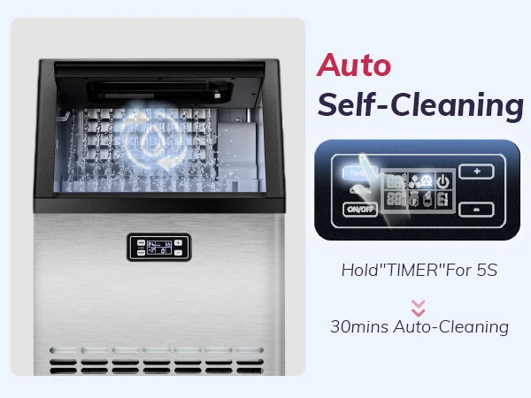 Featured with auto Red Warning indicator on Water Shortage, Ice full storage; Also holding the "Ice/Clean" button for 5 seconds can activate the auto-cleaning program.