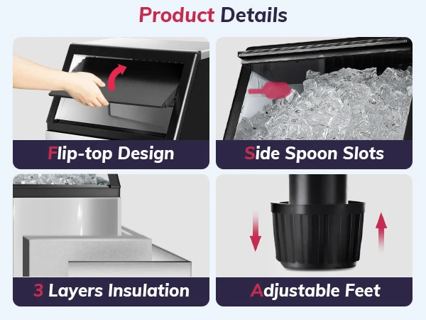 Comes with an ice basket container & ice tongs, all the accessories are included; Simply 3 steps to start making ice: Fill the water tank, Press "Start" button, then awaiting for the process finished.