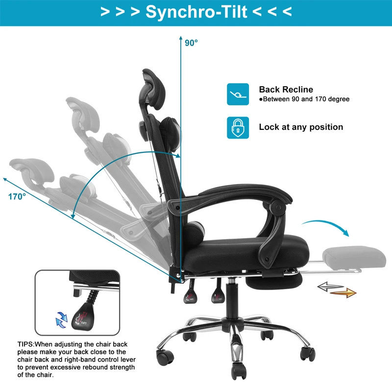 Recline & Lock Function - The backrest can be tilted back, which helps reduce the pressure on the lower back muscles and relax the lumbar area. The recline range is 80 degrees(from 90 to 170 degrees). Plus, you can recline and lock that position at any angle within that range.