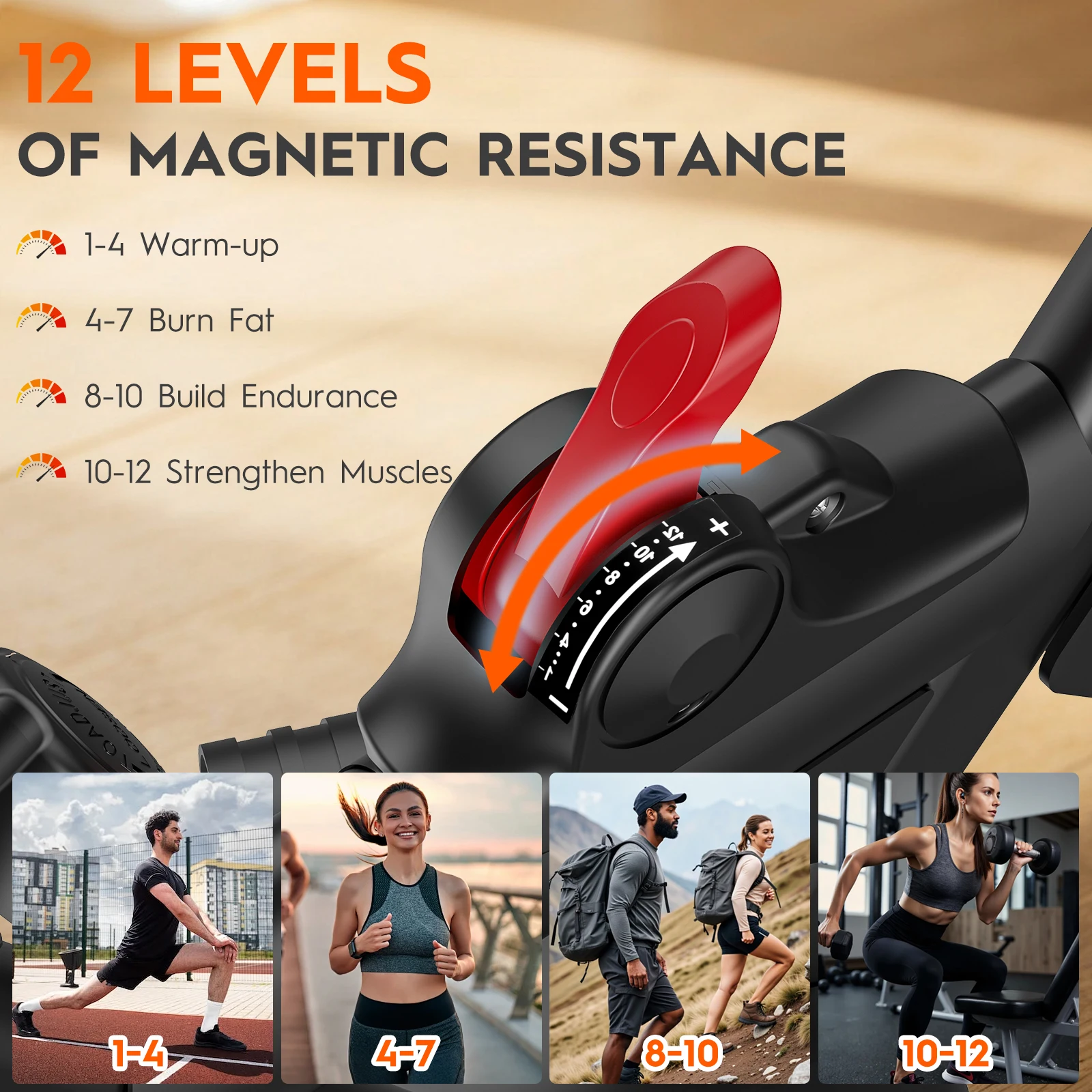 12-level magnetic resistance with 5 magnets: Precise and whisper-quiet resistance adjustment thanks to a high-quality five-magnet system (more than typical 4-magnet models). Smooth, quiet movement for gentle warm-up or demanding interval training.