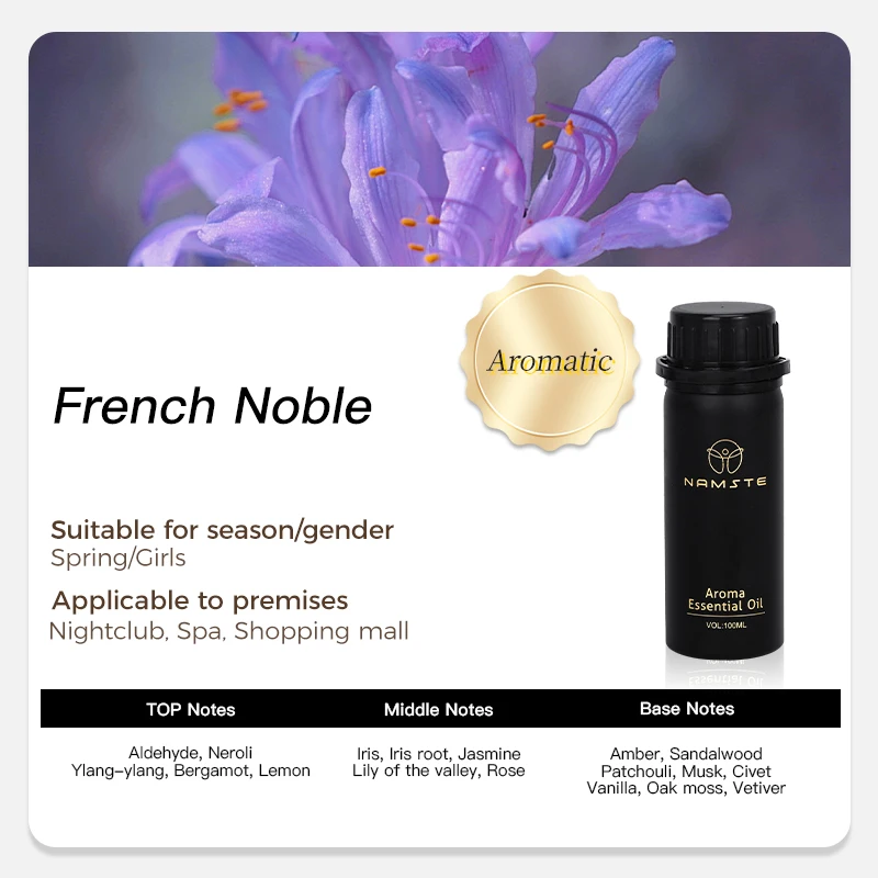 “French Noble is an elegant fragrance with a rich scent profile. Top notes of aldehydes, neroli, ylang-ylang, bergamot, and lemon offer a fresh start. The heart combines iris, orris root, jasmine, lily of the valley, and rose for floral elegance. Base notes of amber, sandalwood, patchouli, musk, civet, vanilla, oakmoss, and vetiver provide warmth. Perfect for those who love a luxurious, complex scent, it's ideal for everyday and special occasions. Experience the timeless elegance of French Noble.”