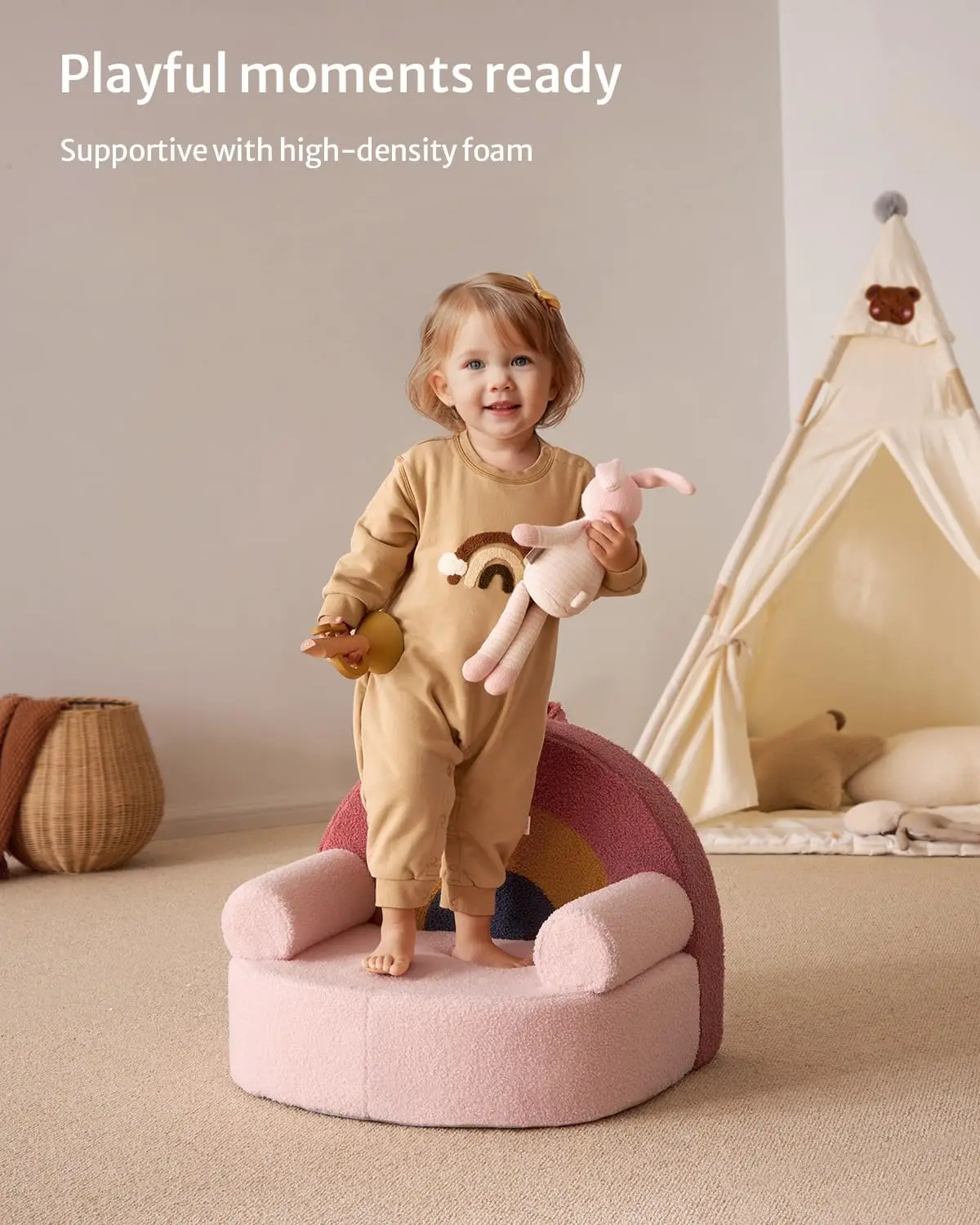 Toddler Chair Comfy, Foam Kids Chair with Soft Teddy Plush, Toddler Reading Chair with Cute Rainbow Designs- Blush Pink
