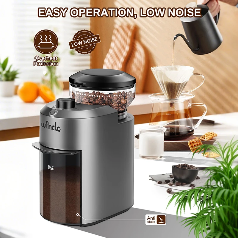 Wancle burr coffee grinder's plastic container is specially treated to prevent static electricity and coffee grounds from sticking. It's also equipped with a brush for easy cleaning.