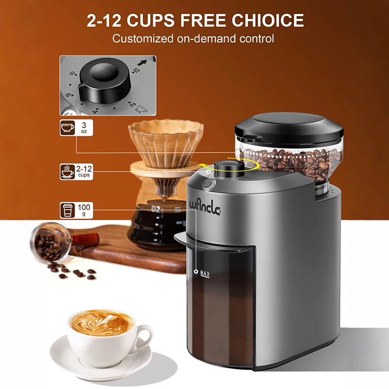 This coffee grinder features on-demand grinding control, allowing you to choose the amount of coffee to grind as needed, from as little as 2 cups to as many as 12 cups, customizing the perfect amount of coffee grounds for you.