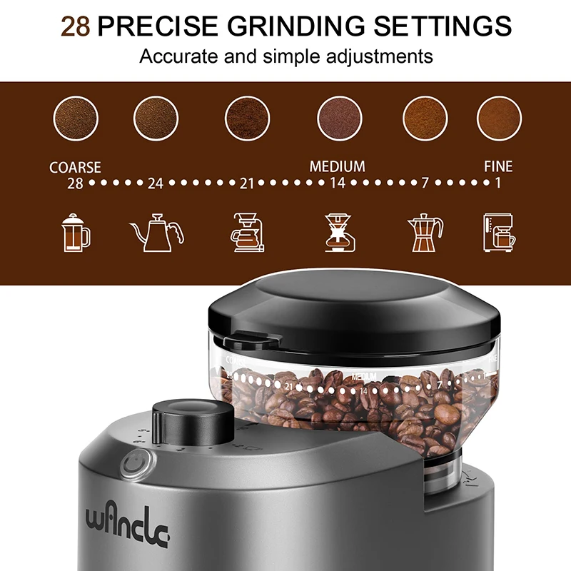 Wancle coffee bean grinder provides 1-28 levels of precision grinding settings from fine to coarse, allowing you to adjust the coarseness of the coffee according to your personal preferences.